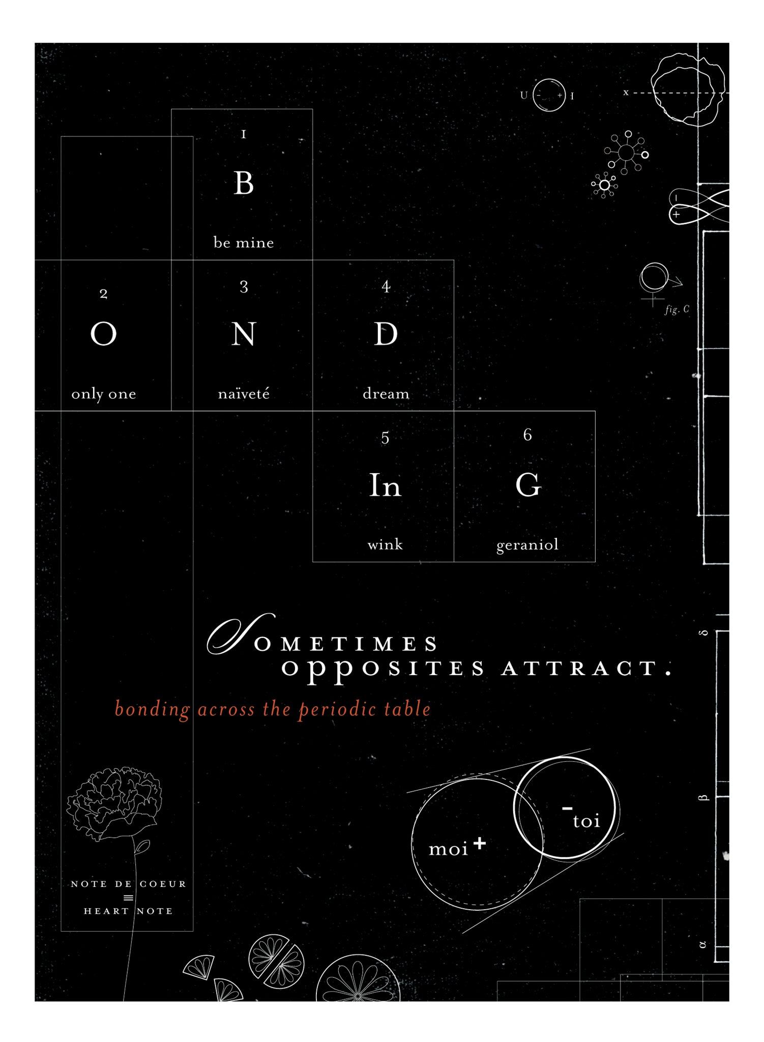 Chemical Bonding playfully juxtaposes Chemistry 101 principles with human attraction. The scent combines citrus notes with a powdery soft base, resulting in a flirtatious alchemy. Like a clean, soft cashmere sweater, let this fresh and modern fragrance envelop you. Fresh top notes of citrus and tea give way to a soft heart of peony, arriving at a soft, powdery base of amber and musk.