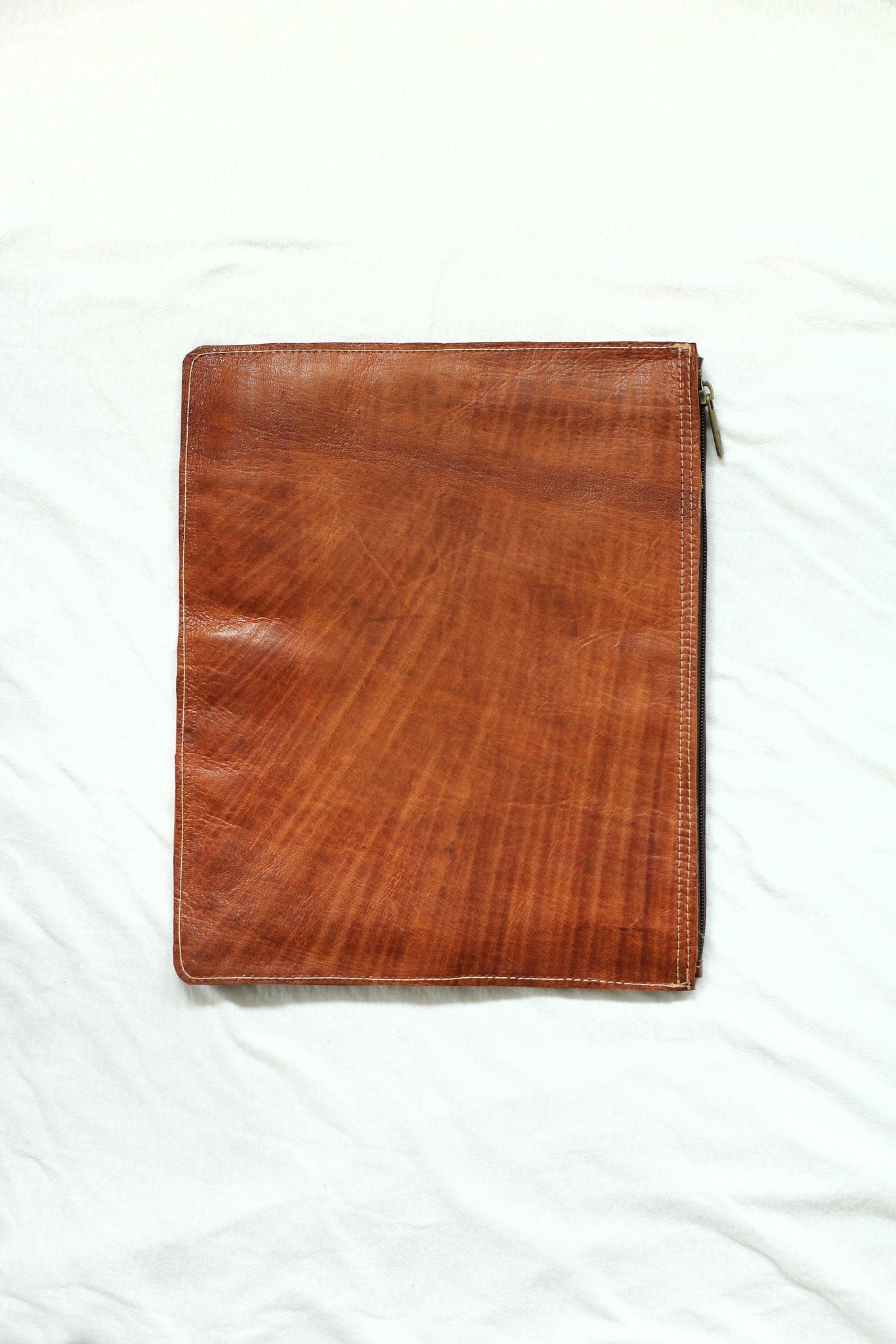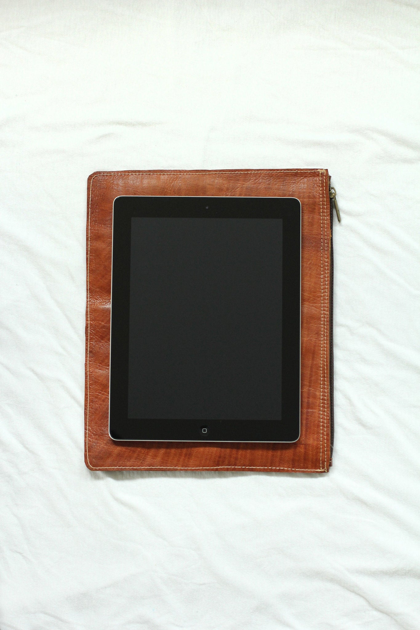 This leather tablet sleeve is perfect for keeping your day's necessities in one place. A tablet slides easily into the pouch, with extra room for a charger, notebook, pens, etc.
